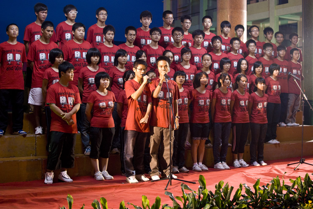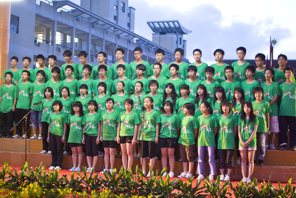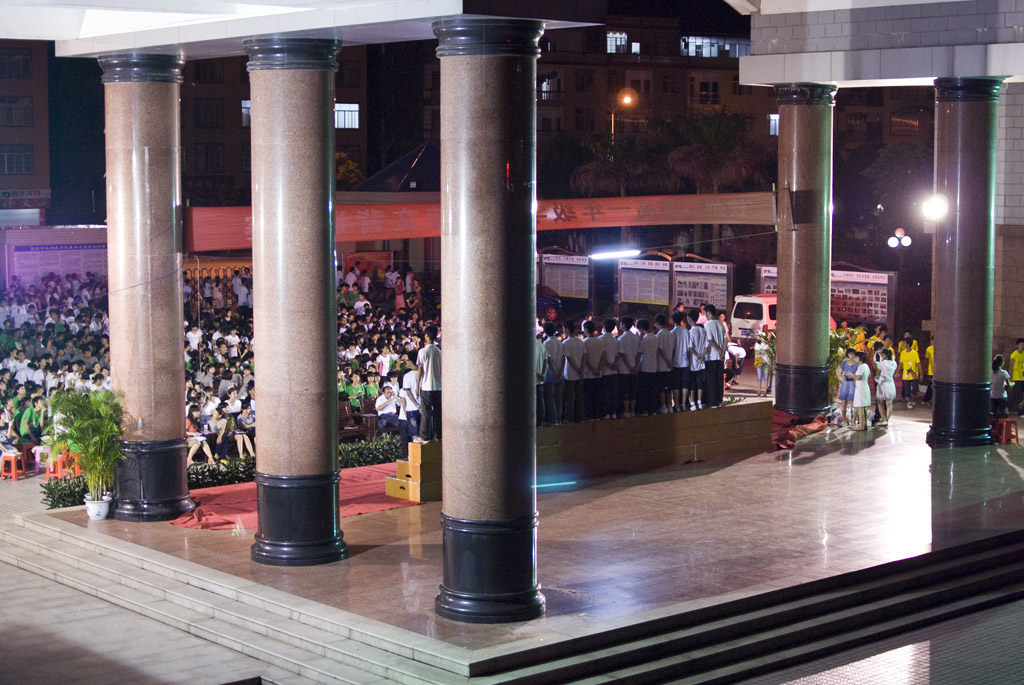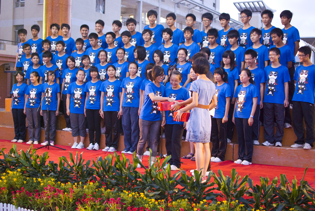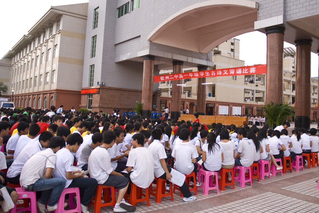 2011年7月1日晚上7点,我校在南门广场舞台举行高一年级学生古诗文背诵比赛,比赛规则是:比赛以班为单位进行,每个班的全体学生按照抽签顺序集体上台背诵抽签的篇目,然后每班随机抽出两名同学、再抽出一首诗歌进行个人背诵,集体得分加上个人得分为班级最后得分,我校语文组的六名老师担任了本次比赛的评委。